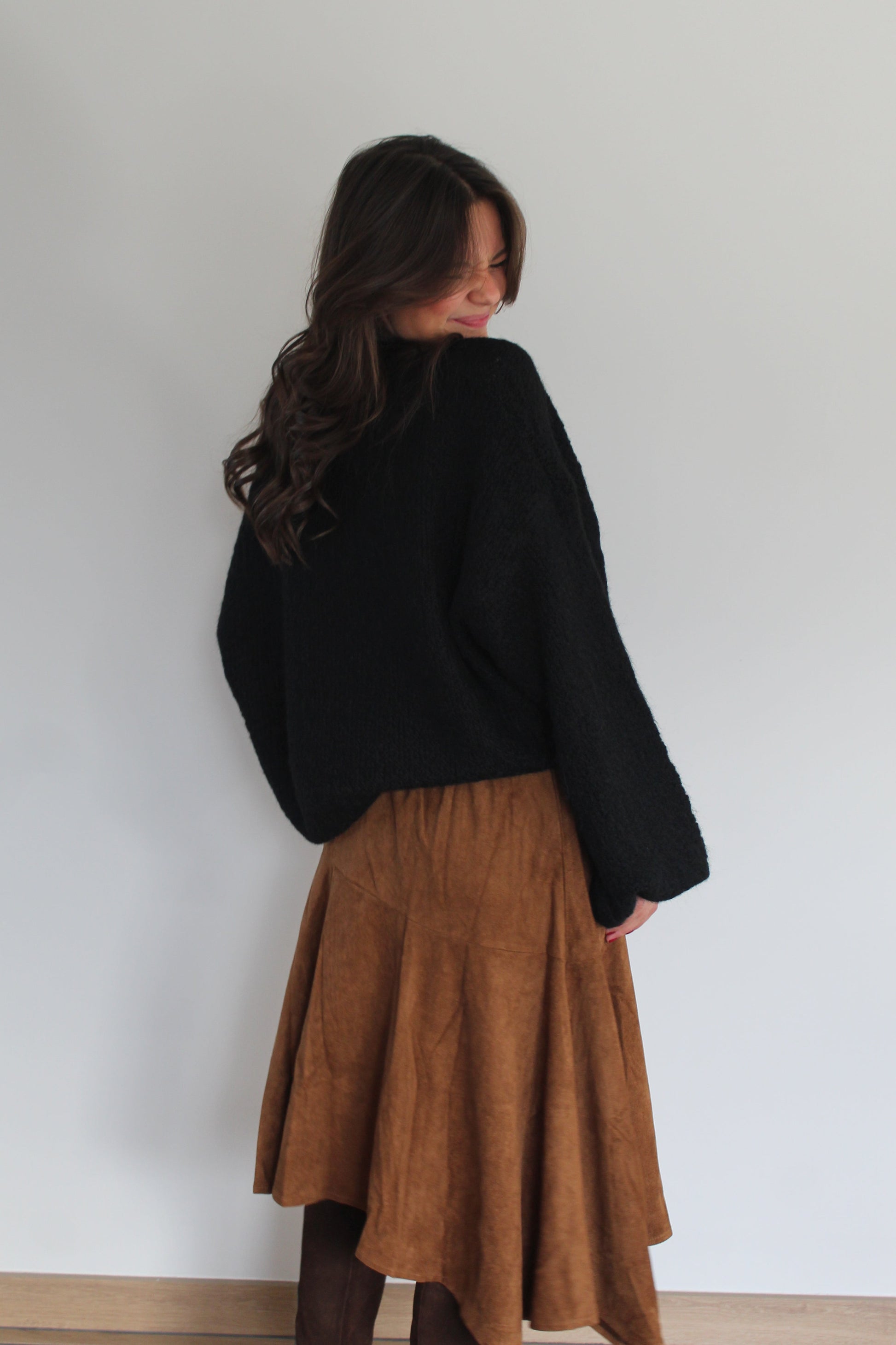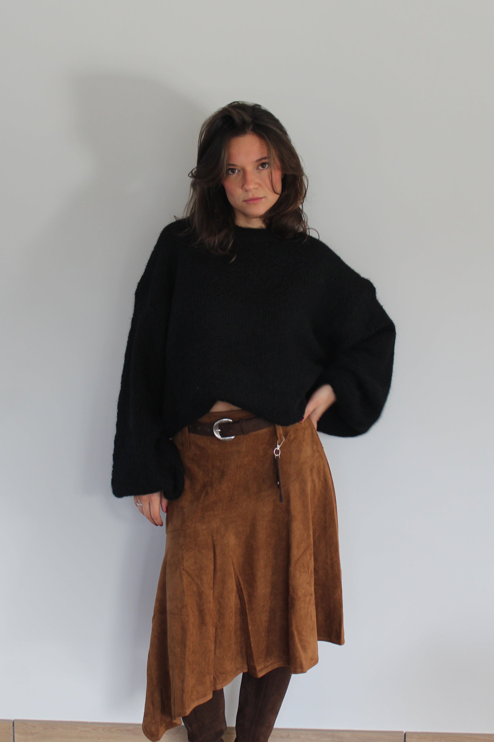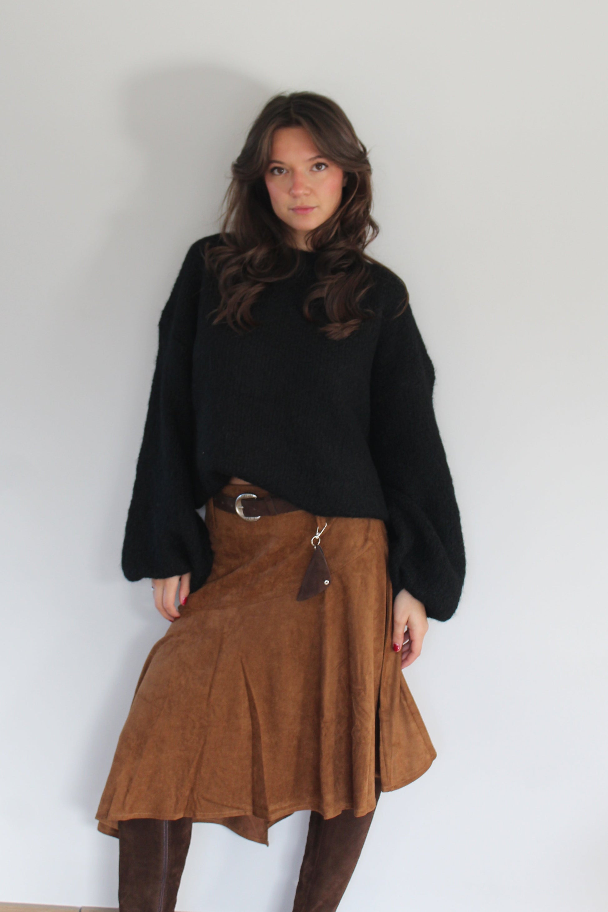 Jupe asymétrique effet suédine avec ceinture et pendentif.