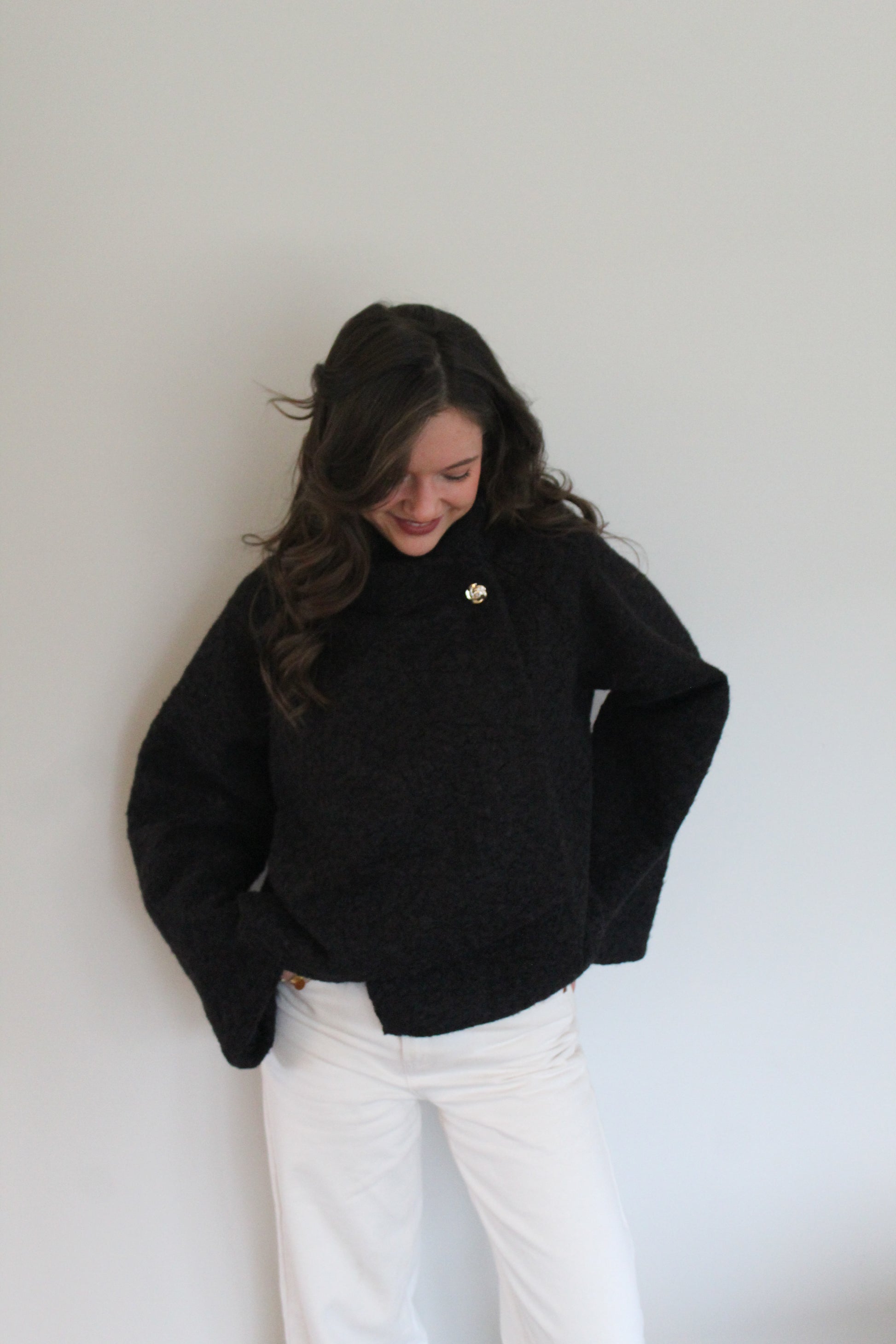 Cette veste en laine bouclée séduit par sa coupe courte à la fois moderne et élégante. Son col montant croisé, fermé par un bouton bijou, apporte une touche chic et raffinée à la silhouette. Douce et agréable à porter, elle est parfaite pour réchauffer vos looks d'automne/hiver. À associer facilement avec un pantalon taille haute, une jupe ou une robe pour une allure soignée et tendance.
