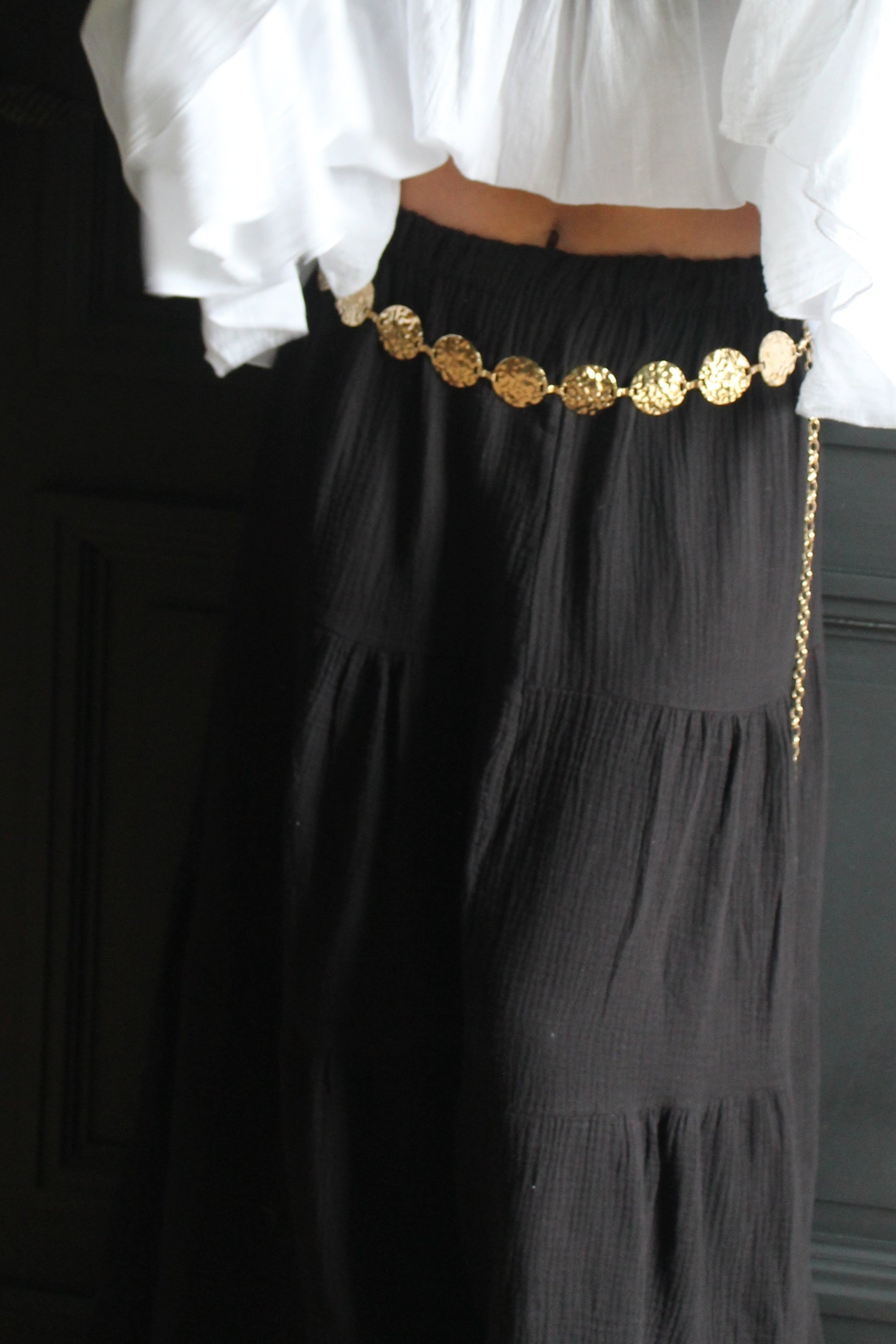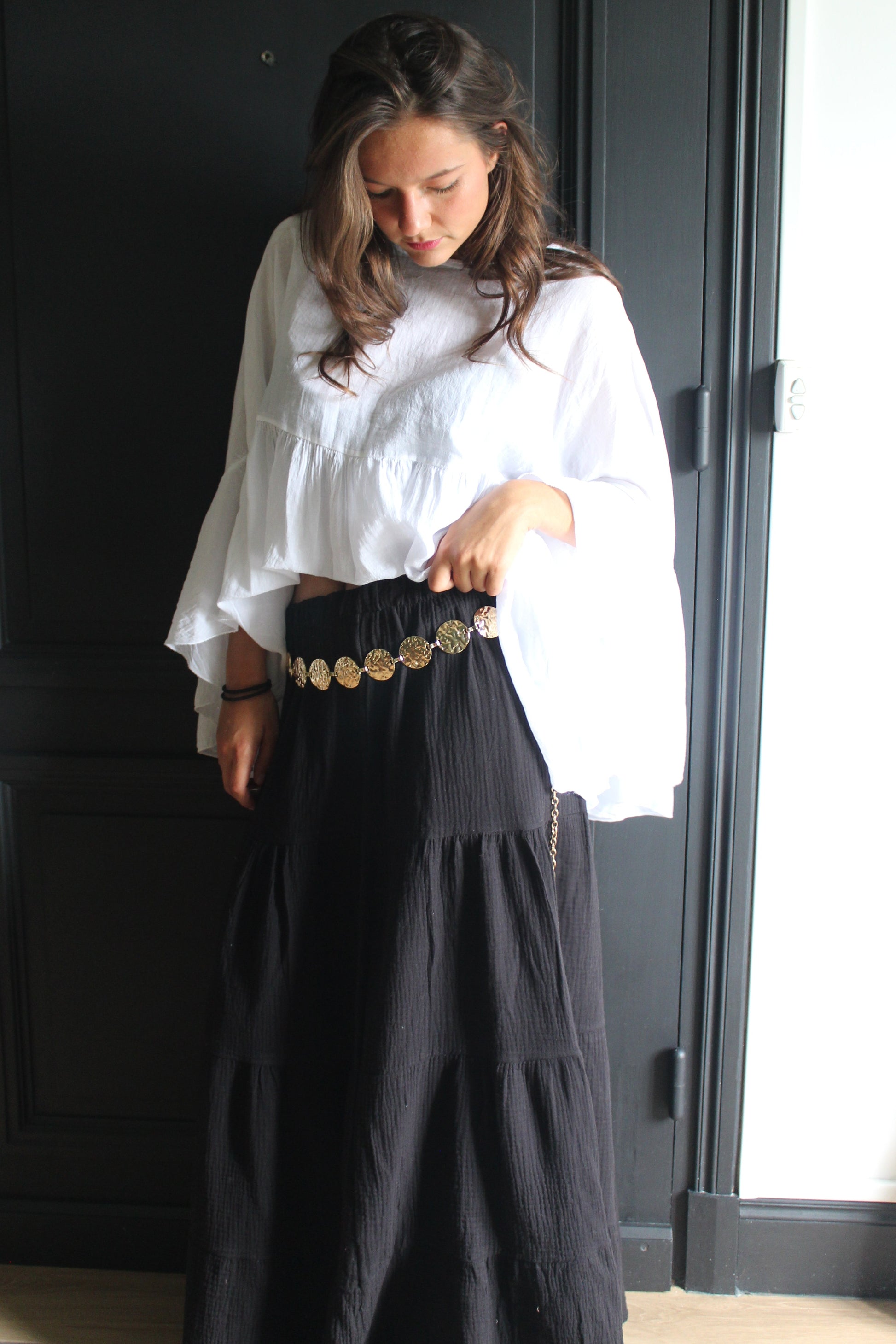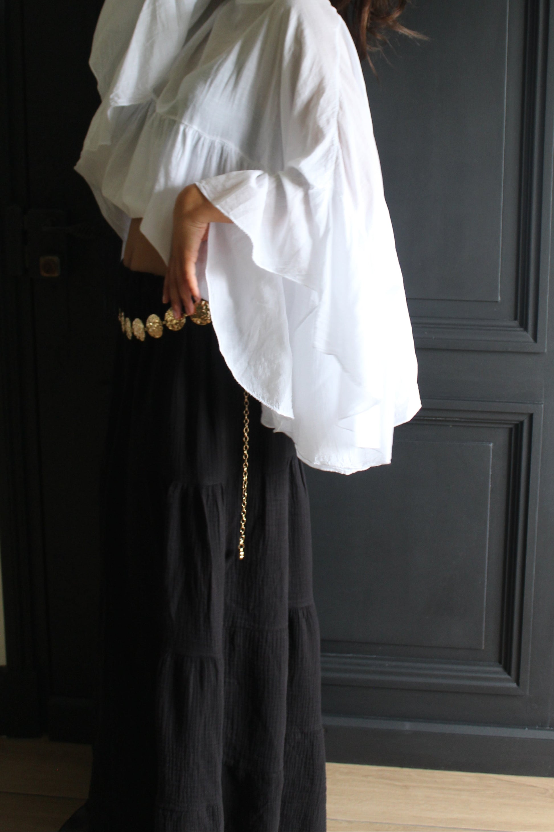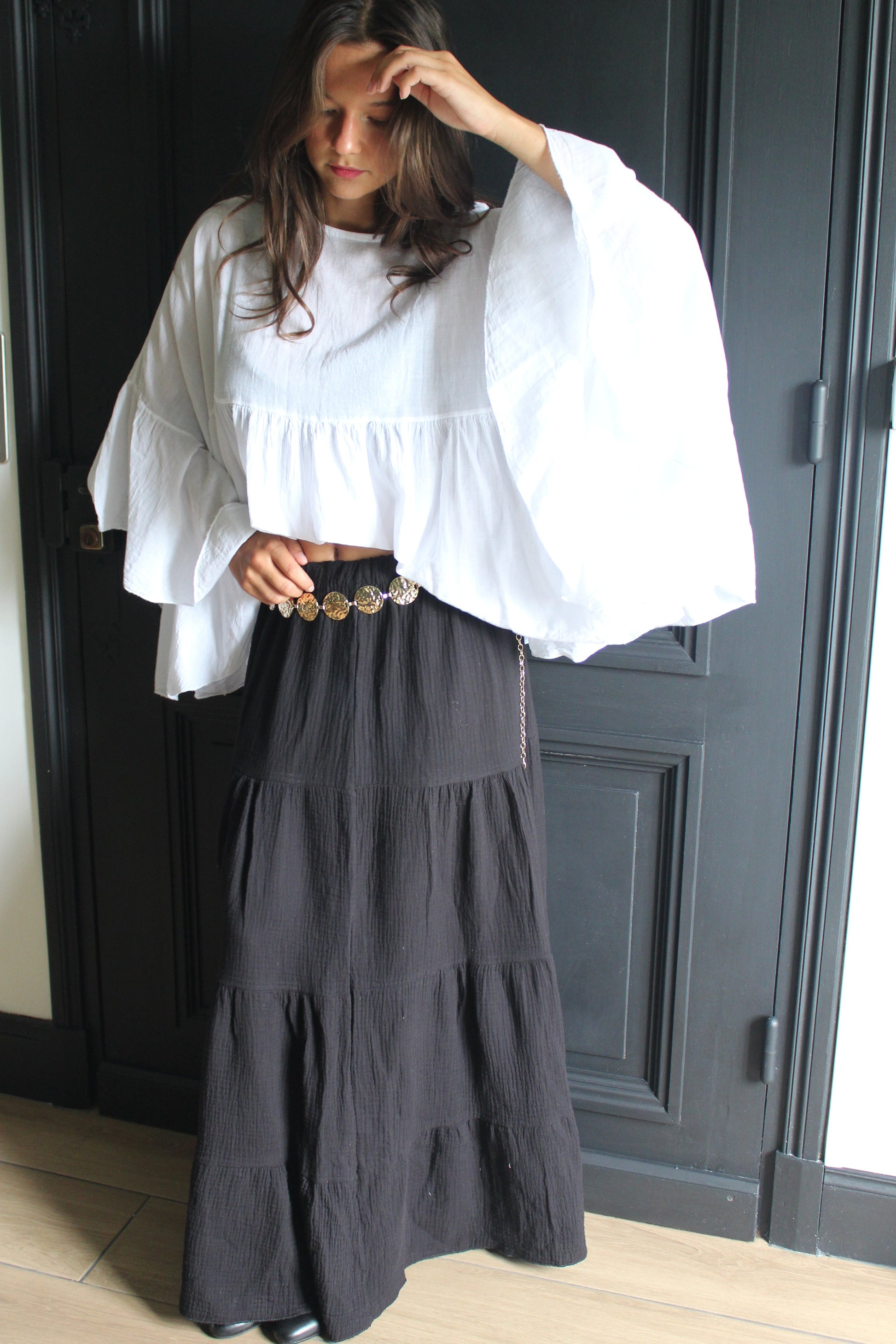 Intemporelle et raffinée, cette jupe noire en gaze de coton allie simplicité et élégance. Confectionnée en Italie, elle offre un tombé fluide et une légèreté idéale pour toutes les saisons. Son tissu doux et aérien assure un confort optimal, tandis que sa couleur profonde en fait une pièce facile à associer, du look décontracté au plus habillé. Un essentiel chic à avoir dans sa garde-robe.