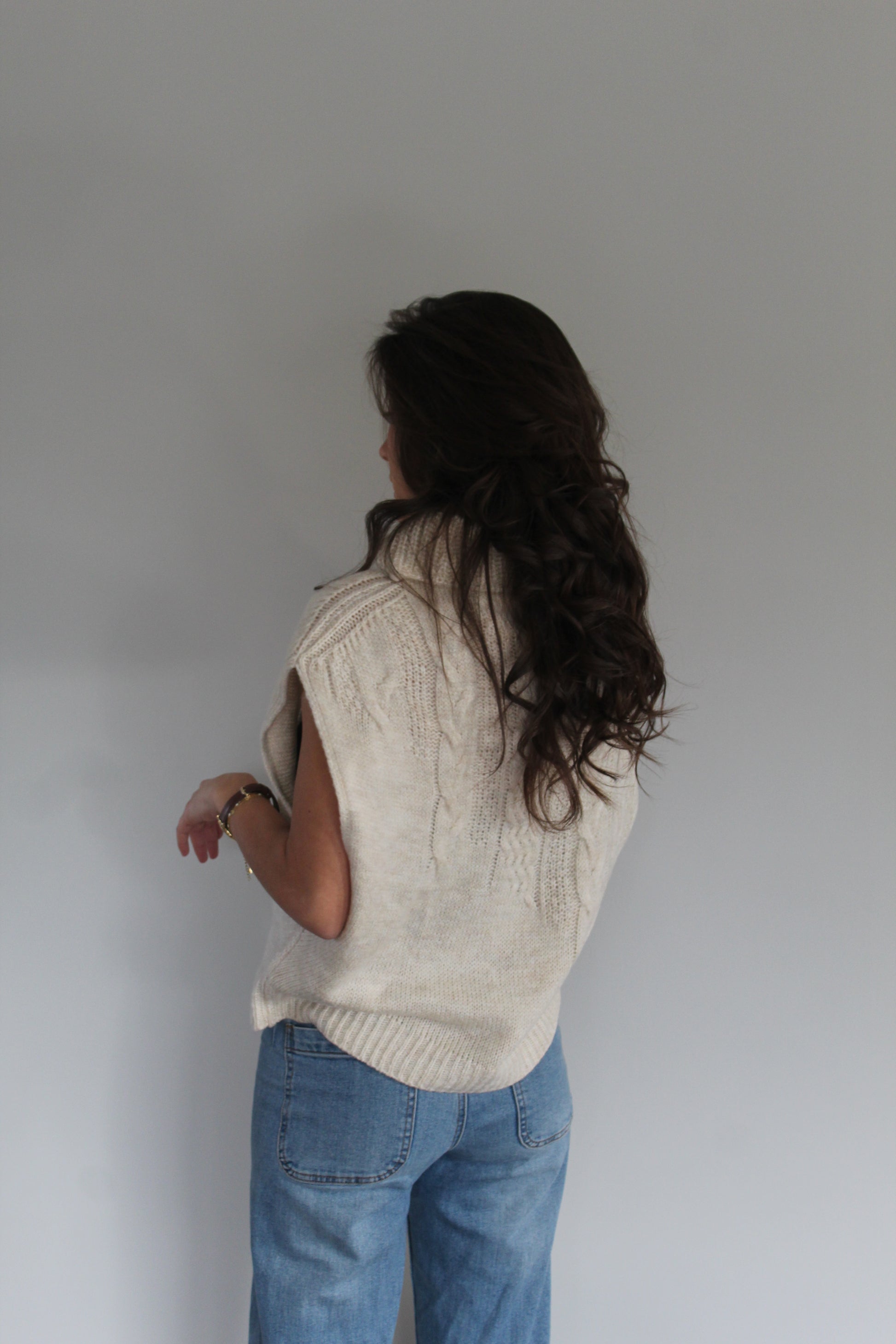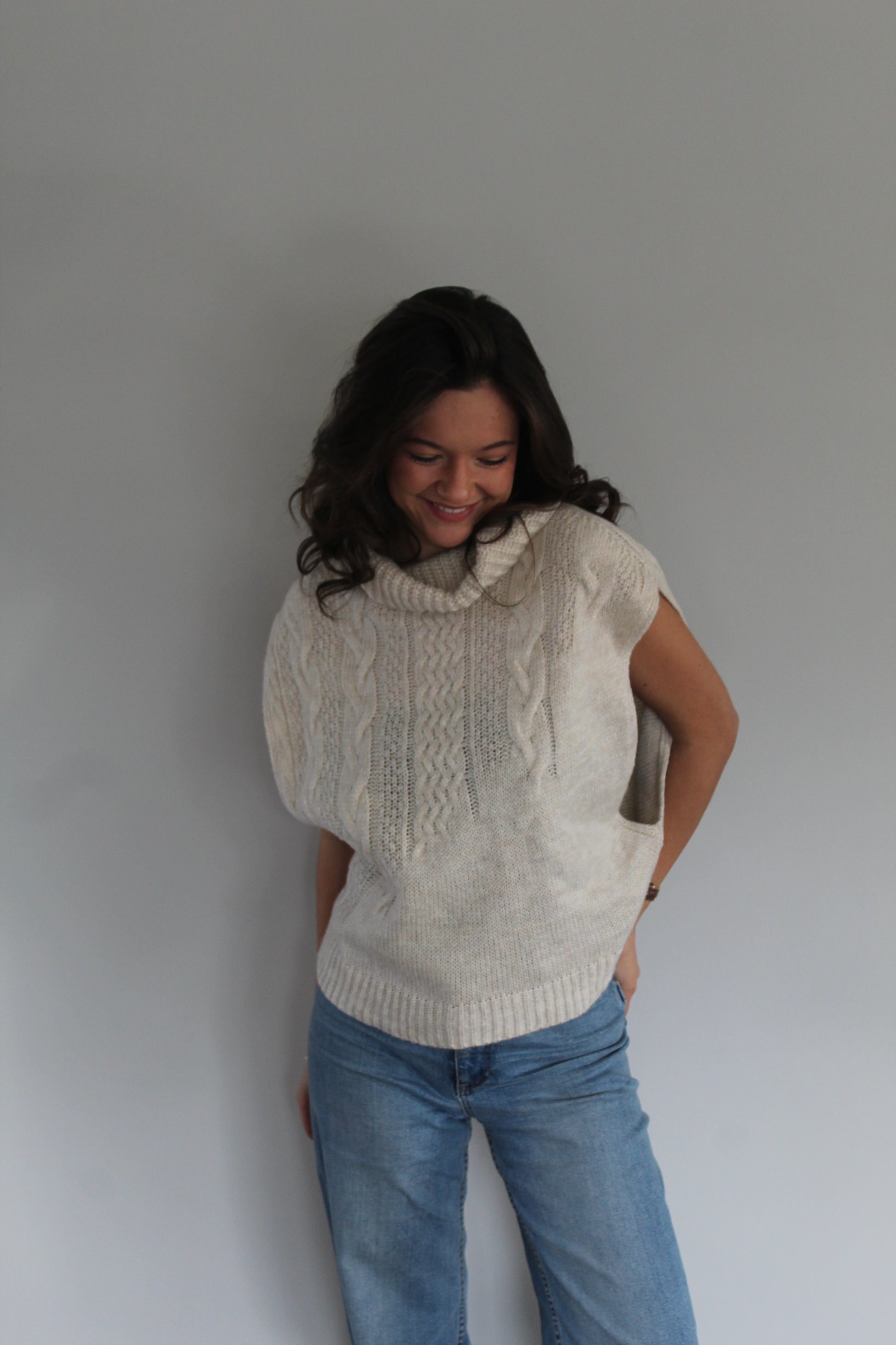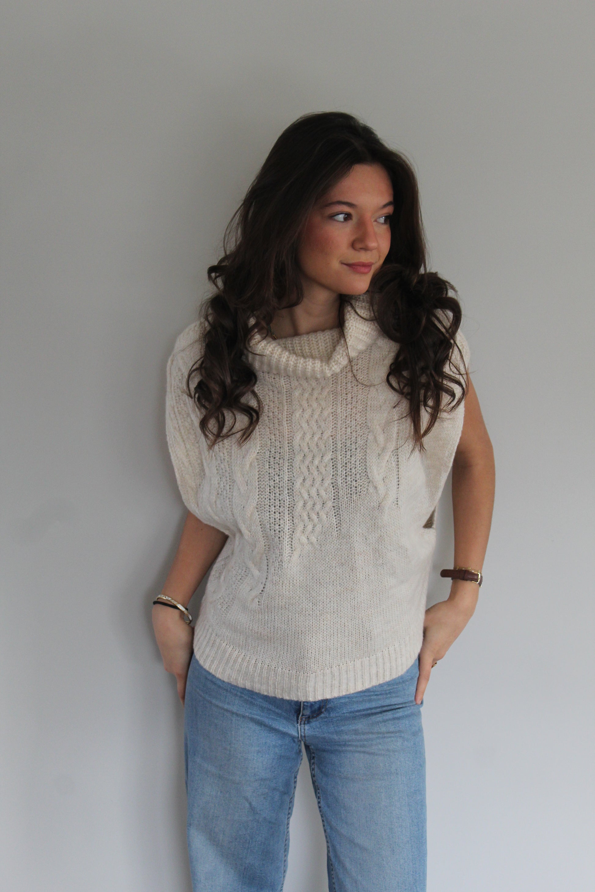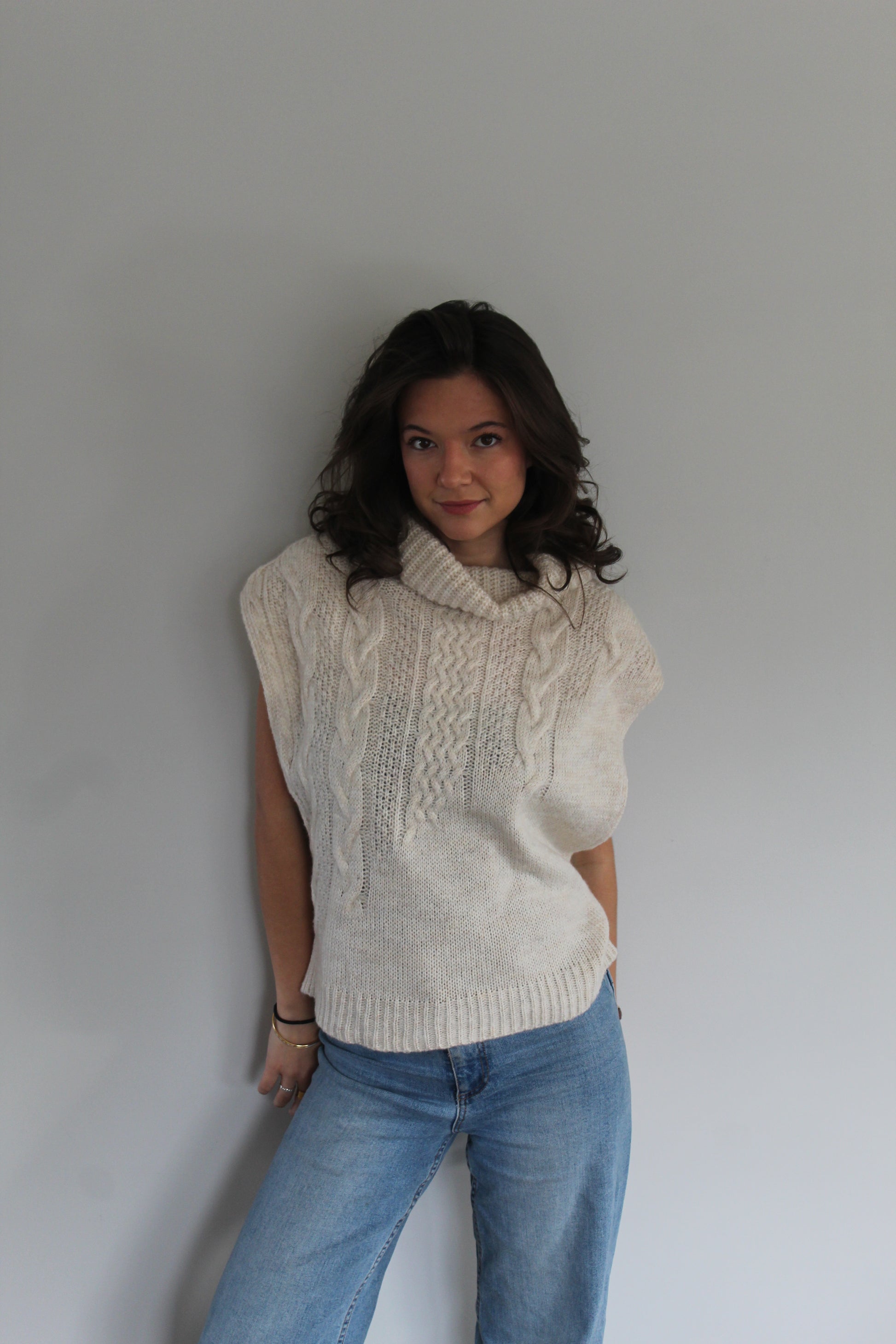 Ce pull sans manches à torsades dégradées est la pièce idéale pour un look chaleureux et tendance. Son col roulé apporte une touche cosy tout en structurant élégamment la silhouette. Parfait à superposer sur une chemise blanche, un t-shirt ou une robe, il offre un style moderne et facile à porter au quotidien.