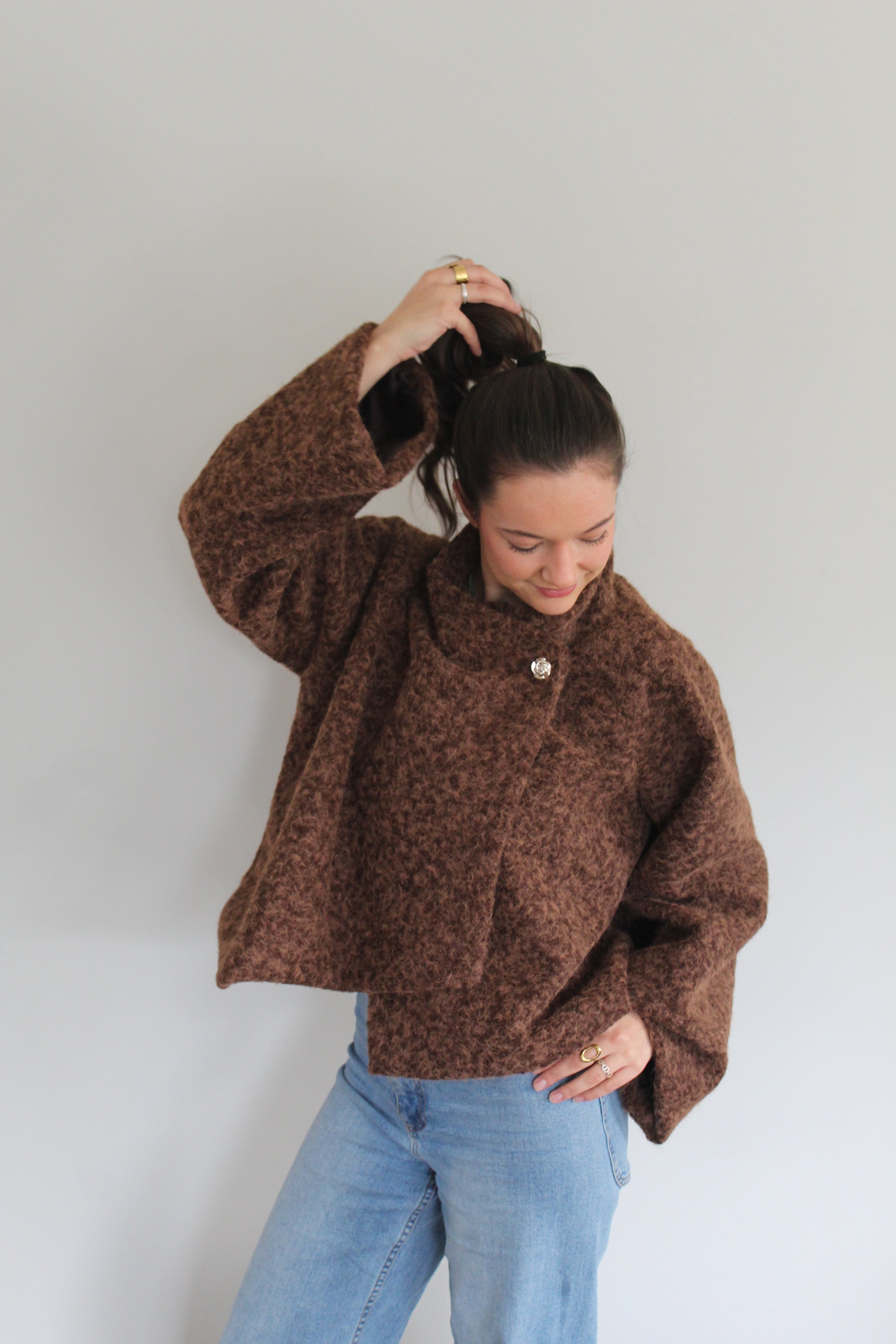 Veste Chic en Laine Bouclée. Col Montant Croisé & Bouton Bijou !