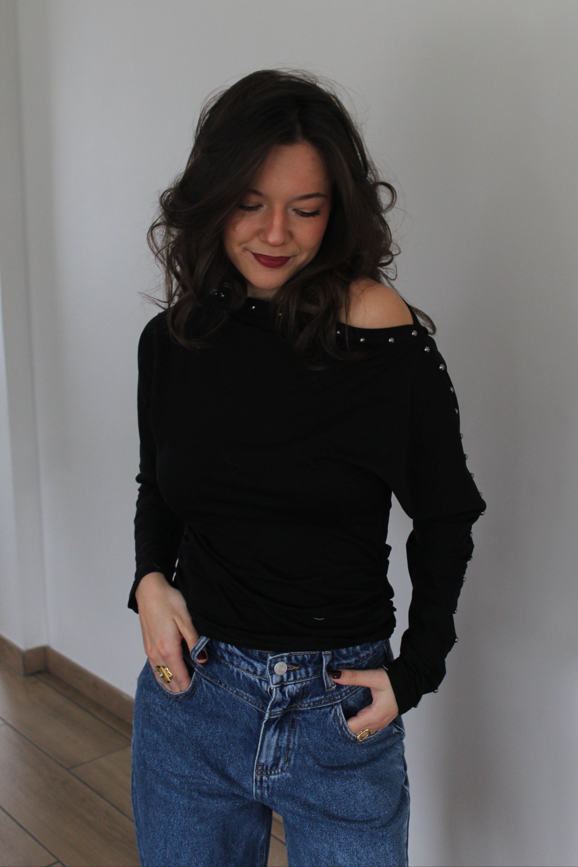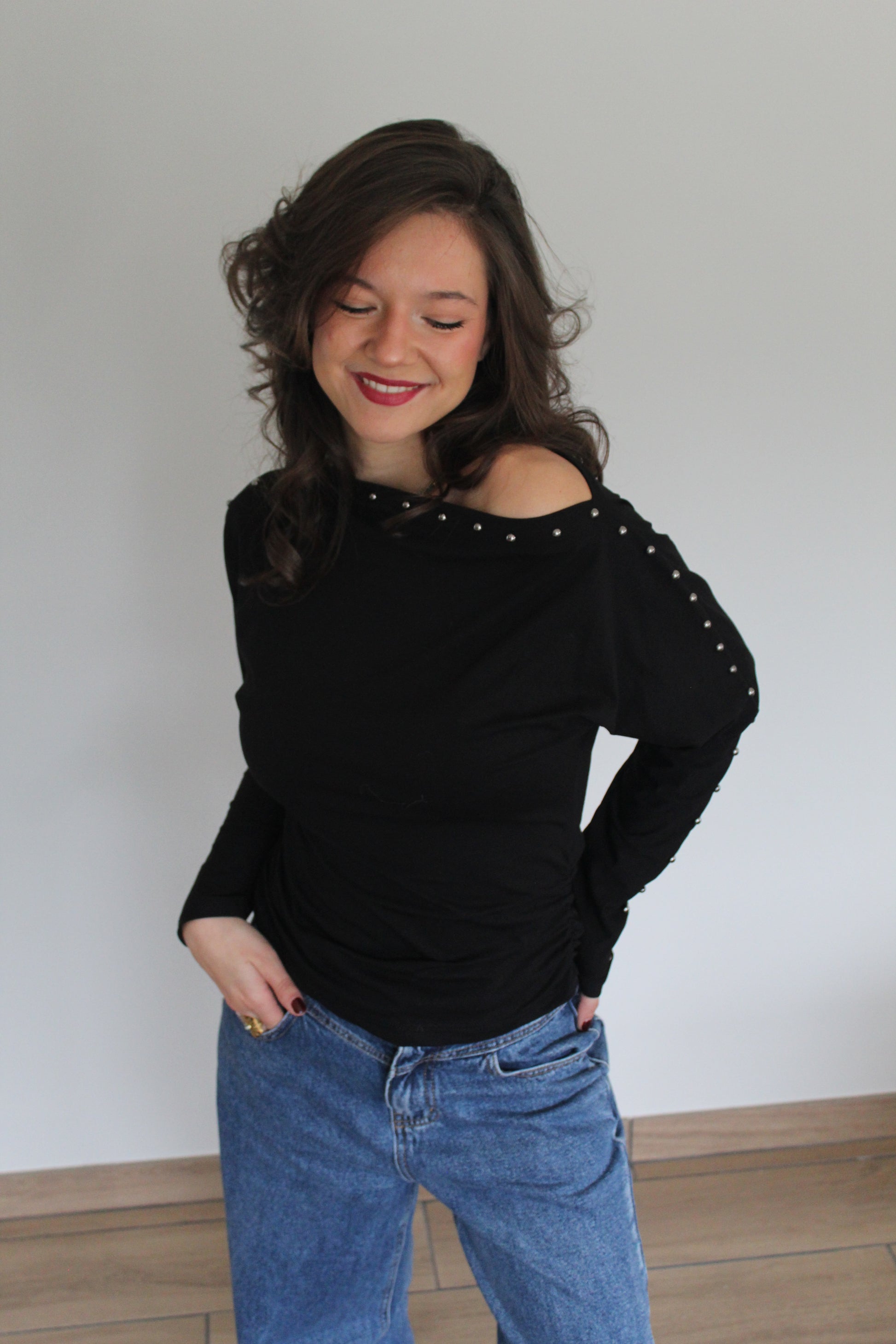 Ses détails cloutés ajoutent du caractère et une note moderne, idéale pour sublimer vos looks du quotidien comme vos tenues plus habillées. Léger et agréable à porter, ce top est une pièce polyvalente qui se marie facilement avec un jean, une jupe ou un pantalon tailleur.