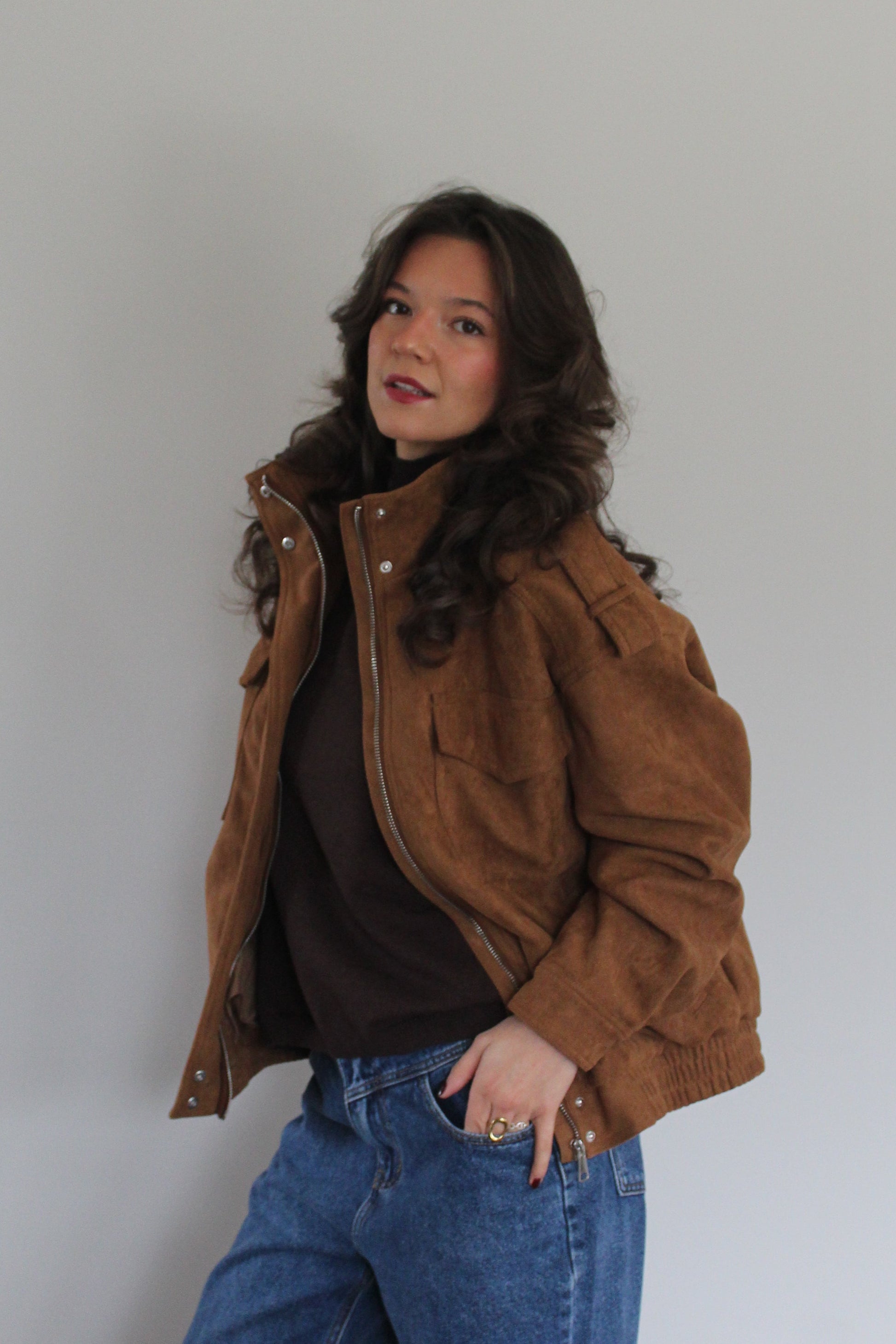 Veste en suédine col montant. Coupe droite élégante !